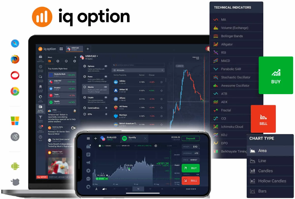 Análise técnica sofisticada, dados históricos acessíveis, belo layout de vários gráficos e muito mais. O IQ Option Broker tem tudo o que você poderia pedir em uma plataforma móvel – e tudo no dispositivo de sua escolha: iPhone, telefones Android, iPads e outros tablets. Tudo fluido e rápido.